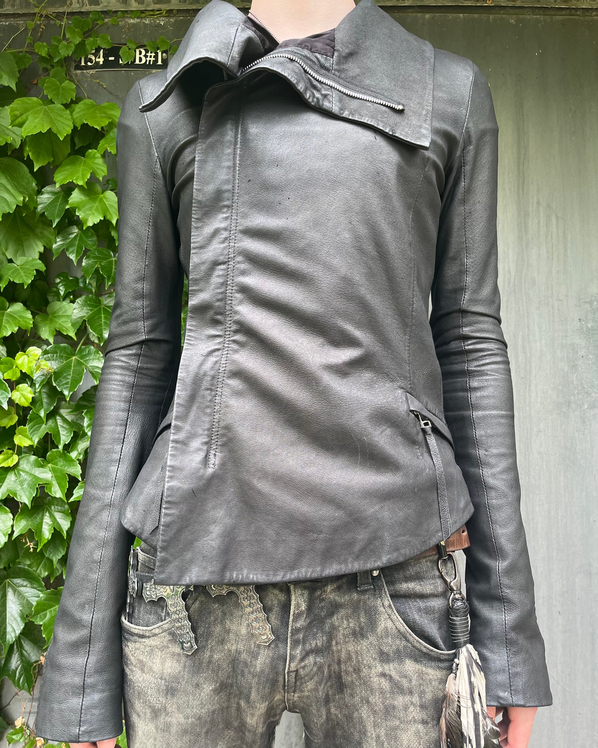 Sleek and versatile, this leather jacket from Ekam features adjustable zippered sleeves, a cowl neck, and distinctive leather pull tabs—subtle design details that elevate it beyond the everyday. Founded by Kanya Miki, Ekam is a Japanese brand rooted in the philosophy of putting the wearer first—derived from the Sanskrit word “Eka”, meaning “the first” or “one.” Miki, an Antwerp Royal Academy graduate and mentee of avant-garde icons like Walter Van Beirendonck and John Galliano, launched the label in 2009. Known for its slim silhouettes, exaggerated collars, and long-line cuts, Ekam channels a refined, Rick Owens-esque energy with a distinctly Tokyo edge. Originally built around leather pieces, the brand reflects Miki’s belief that a great jacket should adapt to any environment—just like this one.